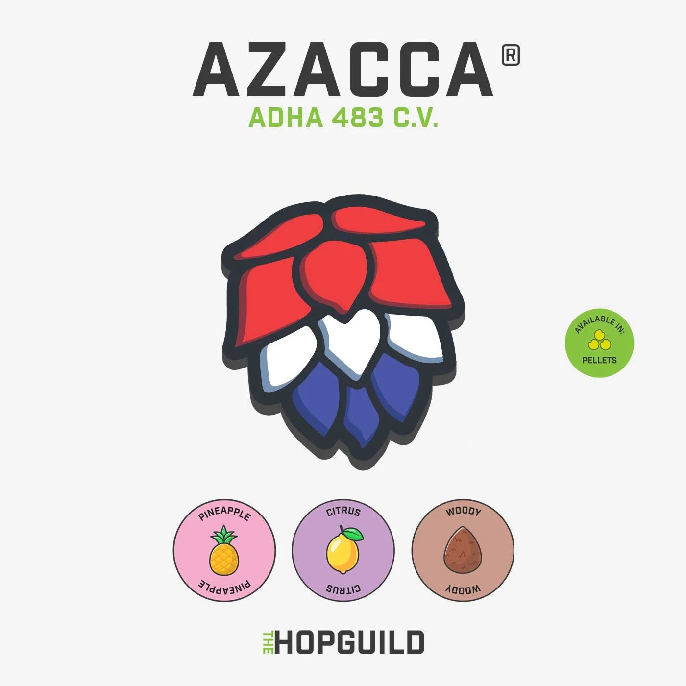 Azacca® was named after the Haitian god of agriculture. It is big in Alpha Acids (14-16%) and has a bright and refreshing aroma with tropical fruits, citrus, and juicy mango. Azacca is a dual-purpose hop that produces sensational single-hopped beers. Try whirlpooling with Azacca after flameout to maximize the juicy flavors and sweet aroma.