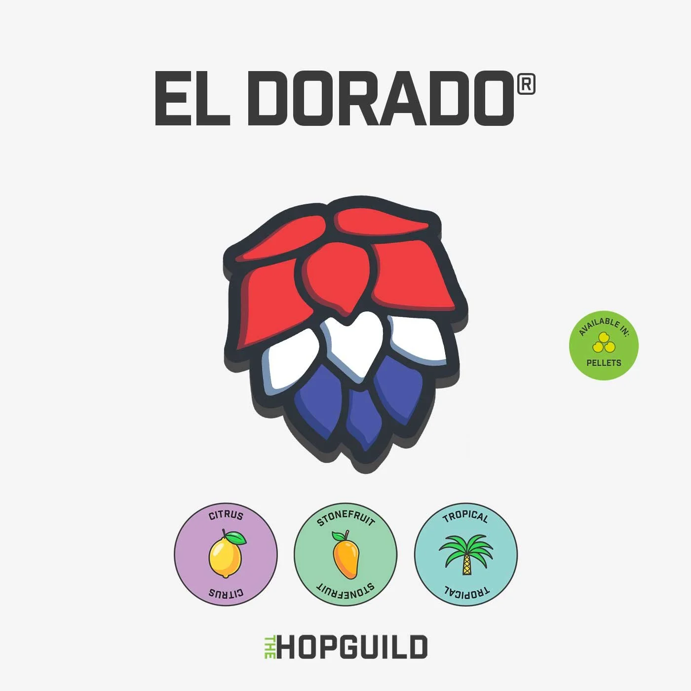This juicy hop was born at CLS Farms in Moxee (a sub-region of the Yakima Valley). Bursting with juicy stone fruit and tropical notes, this dual-purpose hop has been featured in many great beers since its release in 2010. Big Alpha Acids (13-17%) make this an effective and efficient bittering hop, but can be used in late additions to maximize the fresh, fruity aroma and flavor. El Dorado is an exceptional new dual purpose hop with both high Alpha Acid and intense flavors and aromas. As a bittering hop El Dorado lends a firm but balanced bitterness. When used in later additions, El Dorado brings bright tropical fruit flavors and aromas of pear, watermelon, and stone fruit. El Dorado has become a fan favorite in hop-forward styles! The Tropical Hop®