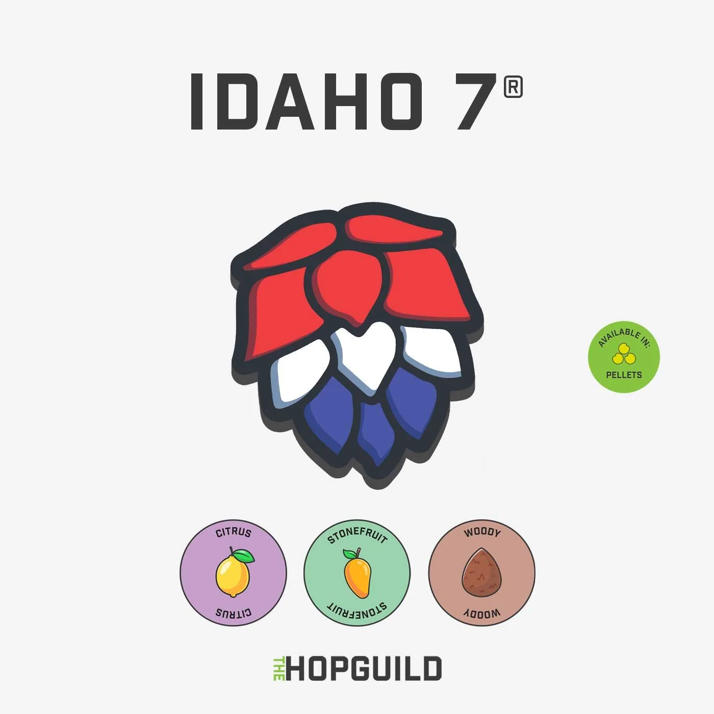 Idaho 7® is a hop named for the pride of it’s original state. Developed and grown by Jackson Hop Farm in Wilder, Idaho and now managed by Yakima Chief Ranches. Idaho 7 is a high yielding hop with very large dense cones that is picked late in the season.