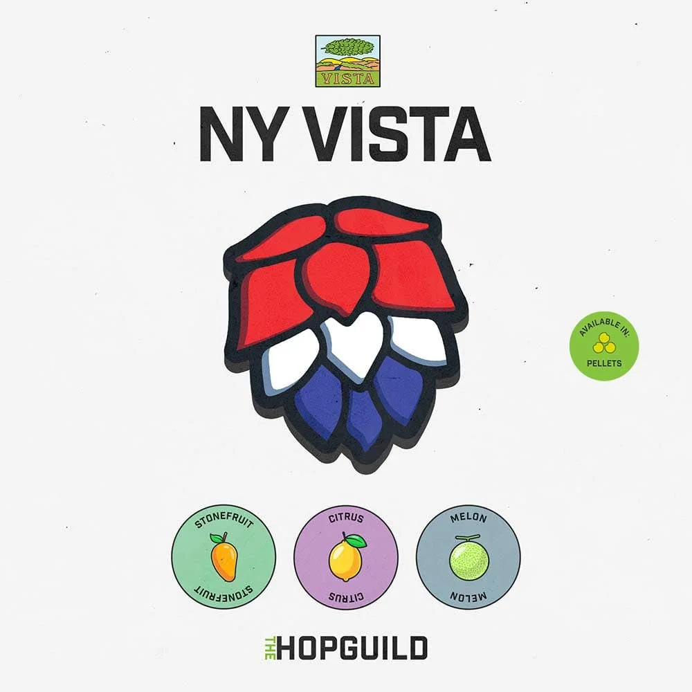 Vista was released in 2021 by the USDA Breeding program in Corvallis, Oregon by John Henning. Previously known as USDA Elite line EXP 074. Vista is the newest public released hop to come out of the USDA program and is the first to be toted as a Tropical Fruit Bomb! Its name was chosen by The Boston Beer Company via a contest for naming the variety. This beast of a hop is one of the highest agronomic performers in New York State. We are stoked for you to try and are glad that this sustainable hop is already getting the love that it deserves. Its mix of flavors works great for Lagers and taking IPA’s into the next generation of drinkers with its Tropical and Stone Fruit elements and a 7 out of 10 potency level!
